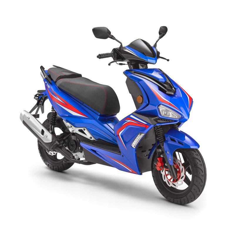 Mit dem F18 haben wir einen Roller entworfen, der seinesgleichen sucht. Die spitz zulaufende Frontpartie mit den schräg angestellten LED-Scheinwerfern geben dem Fahrzeug den angesagten "bösen Blick". Elegante Dekorsets unterstreichen die scharfen Linien der sportlich gehaltenen Karosserie. Für den Beifahrer stehen ausklappbare Aluminium-Fußrasten zur Verfügung. Auch die schicken Fünf-Speichen-Felgen sind aus Aluminium. Das Triebwerk des F18 hat die neue EURO5-Norm, ist spritzig, aber dennoch sparsam.